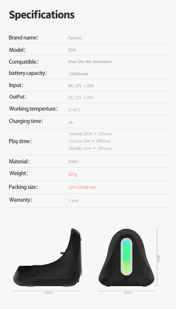 - 【Plug and Play】The integrated design of the ED4 battery base and the Echo dot 4th generation voice speaker is simple to use. It can battery the Echo dot 4th generation while charging. The Echo dot 4th can be used in the battery base for a long time without removing it.