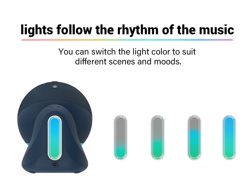 - 【Music rhythm lights】ED5 also provides a light on music rhythm, only when playing music,The lights move to the rhythm of the music, and the lights can customize the light colorand mode, the light can also show the power level more accurately. Make the Echo more agile.