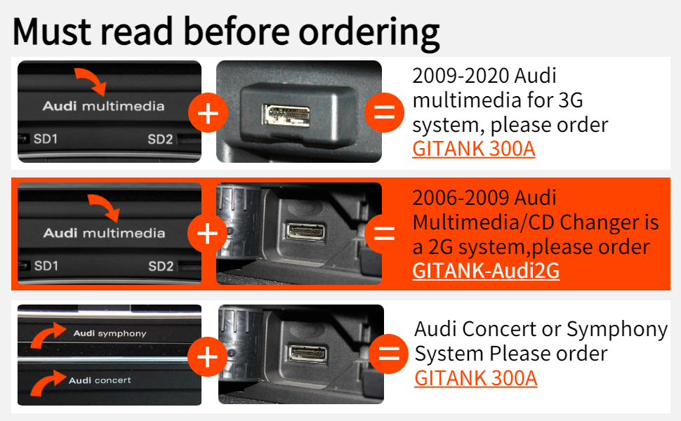 - GITANK-300A is not compatible with 2006-2009 Audi MMI 2G system. If you are Audi MMI 2G system, please order GITANK-Audi2G, which is specially designed for Audi MMI 2G system.